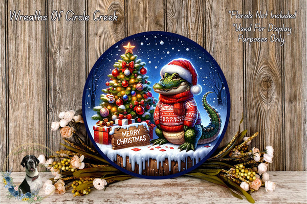 Alligator Merry Christmas Sign | Funny Southern Holiday Decor | Lightweight Round Metal Wreath Sign | No Holes in Sign | Christmas Gator