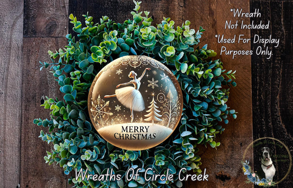 Ballerina Snow Globe Sign | Elegant Merry Christmas Decor | Lightweight Round Metal Wreath Sign | No Holes in Sign | Nutcracker Holiday Sign