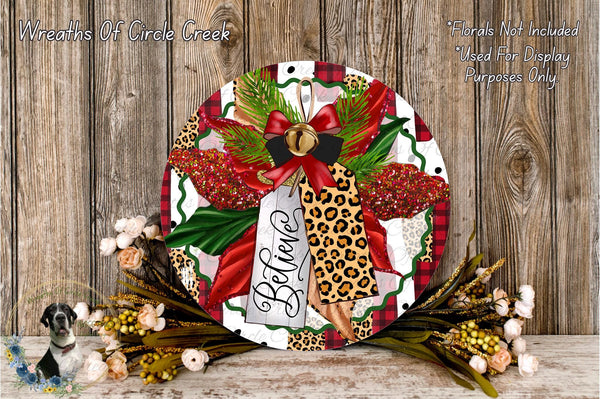 Believe Christmas Sign | Buffalo Plaid and Leopard Print Decor | Lightweight Round Metal Wreath Sign | No Holes | Holiday Door Sign