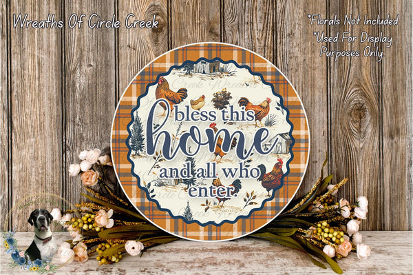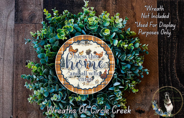Bless This Home Chicken Sign | Lightweight Round Metal Wreath Sign | No Holes in Sign | Farmhouse Rooster Decor