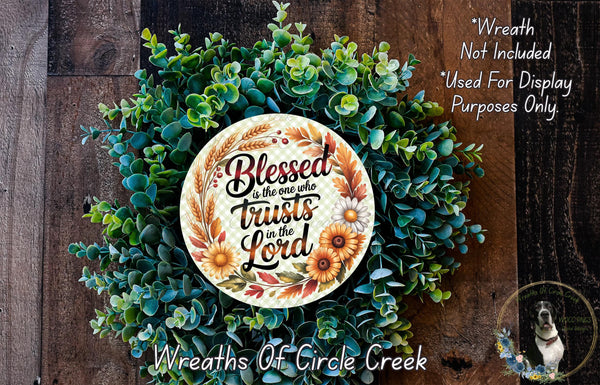Blessed Is the One Who Trusts in the Lord | Fall Christian Decor | Lightweight Round Metal Wreath Sign | No Holes in Sign | Faith Autumn