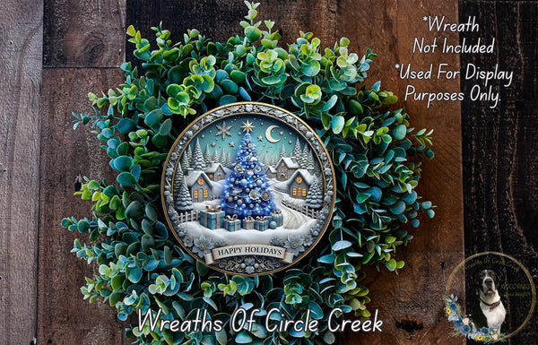 Blue Christmas Tree Sign | Winter Wonderland Holiday Decor | Lightweight Round Metal Wreath Sign | No Holes in Sign | Happy Holidays Sign