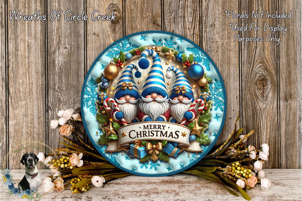 Blue Gnome Merry Christmas Sign | Winter Wonderland Decor | Lightweight Round Metal Wreath Sign | No Holes in Sign | Holiday Door Decoration