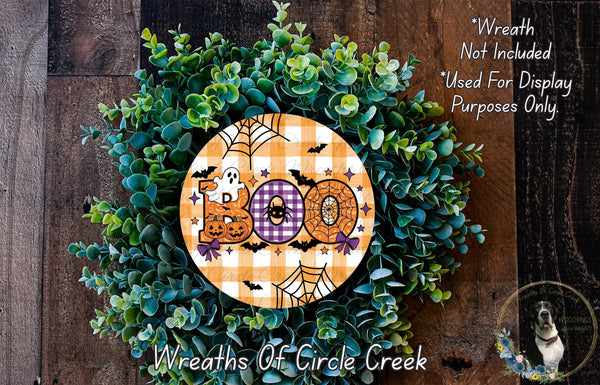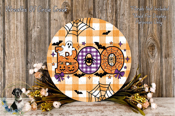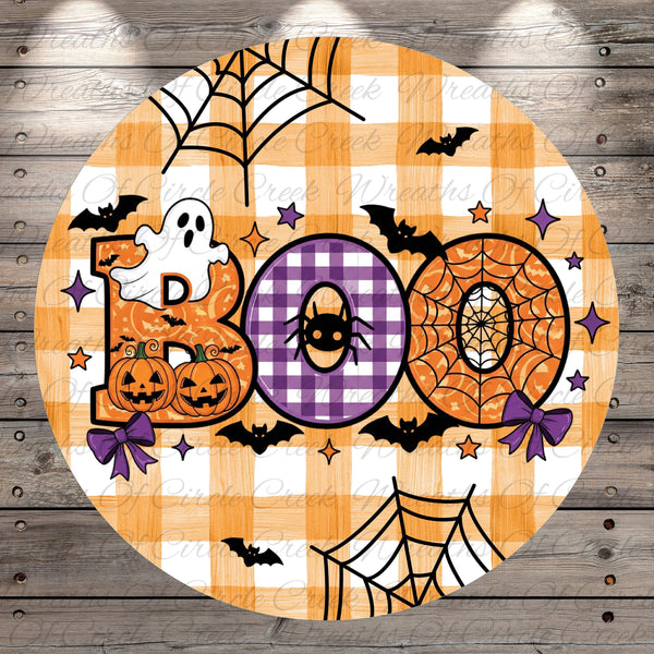 Boo Halloween Buffalo Check Ghost Pumpkin Aluminum Metal Wreath Sign (Lightweight, No Holes)
