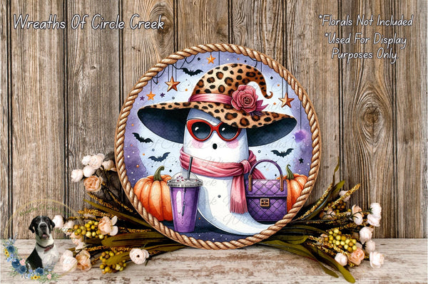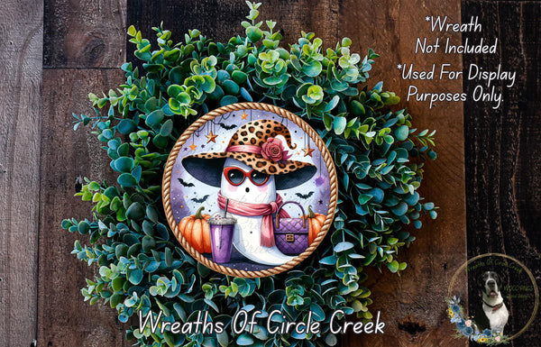 Boujee Leopard Hat Ghost Aluminum Metal Wreath Sign (Lightweight, No Holes)
