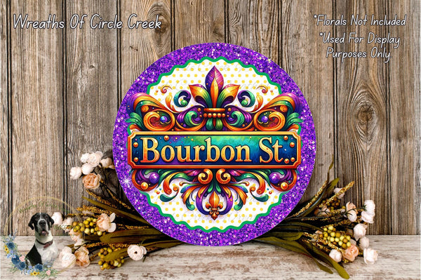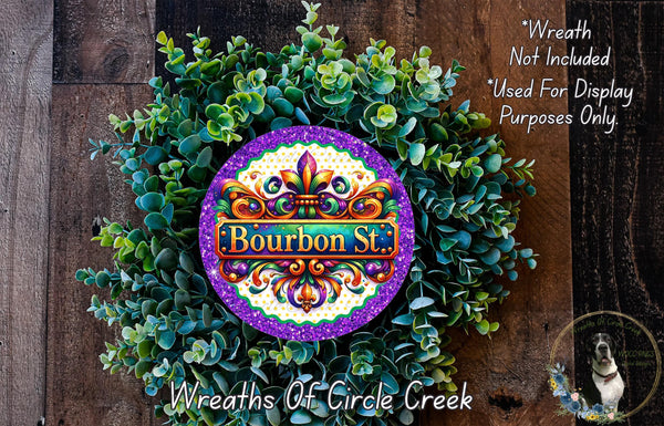 Bourbon St. Mardi Gras Sign | Fleur de Lis Glitter Decor | Lightweight Round Metal Wreath Sign | No Holes in Sign | Carnival Party Sign