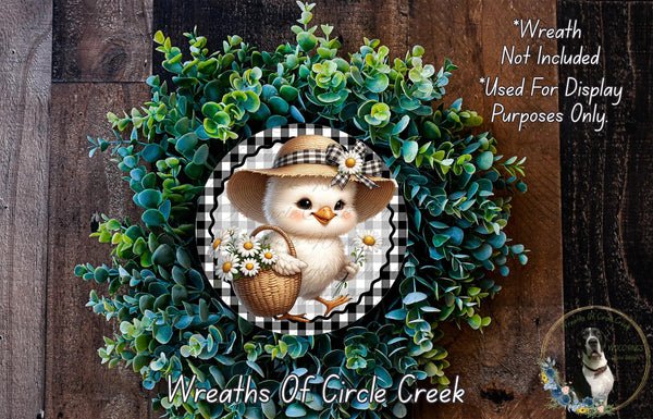 Buffalo Plaid Chick with Daisy Basket | Spring Farmhouse Decor | Lightweight Round Metal Wreath Sign | No Holes in Sign | Easter Chick Sign