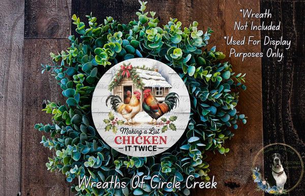 Chicken It Twice Christmas Sign | Farmhouse Holiday Decor | Lightweight Round Metal Wreath Sign | No Holes | Country Christmas Sign