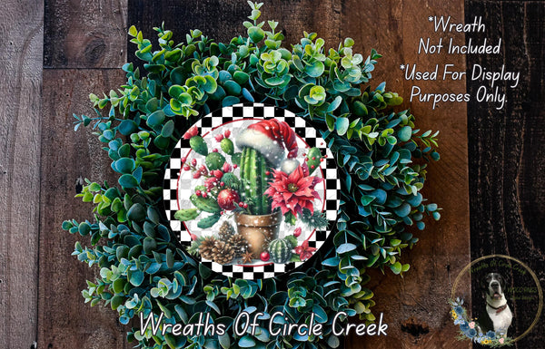 Christmas Cactus with Santa Hat | Poinsettia & Pinecone Holiday Decor | Lightweight Round Metal Wreath Sign | No Holes in Sign | Farmhouse