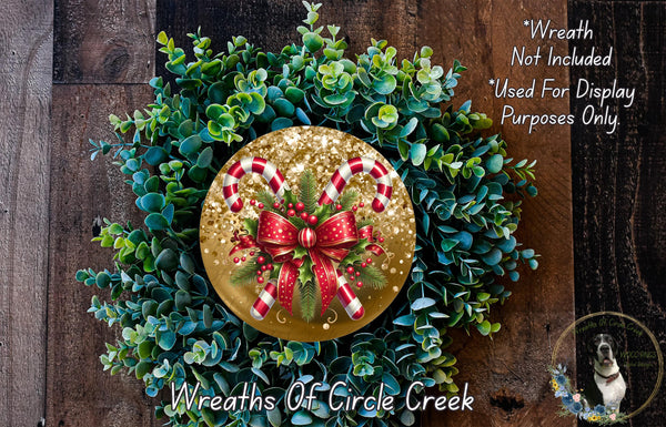Christmas Candy Cane Wreath Sign | Red Bow, Holly & Candy Canes on Gold Glitter | Lightweight Round Metal Wreath Sign | No Holes | Holiday