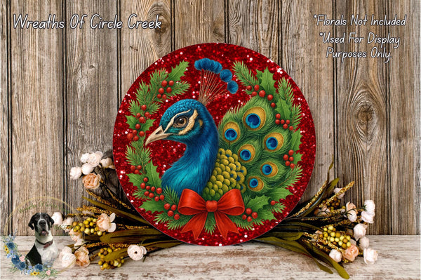 Christmas Peacock Decor | Red Glitter Holiday Wreath Sign | Lightweight Round Metal Wreath Sign | No Holes in Sign | Elegant Holiday Bird