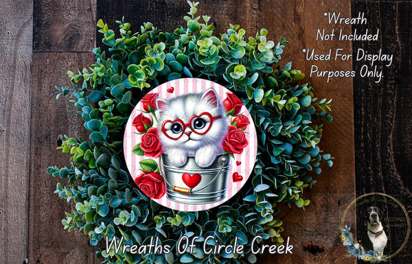Cute Kitten Valentine Sign | White Cat with Roses | Lightweight Round Metal Wreath Sign | No Holes in Sign | Sweet Heart Decor