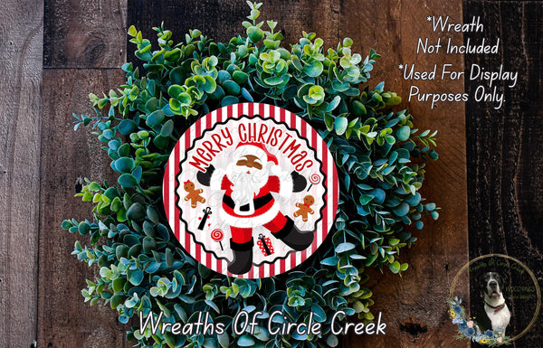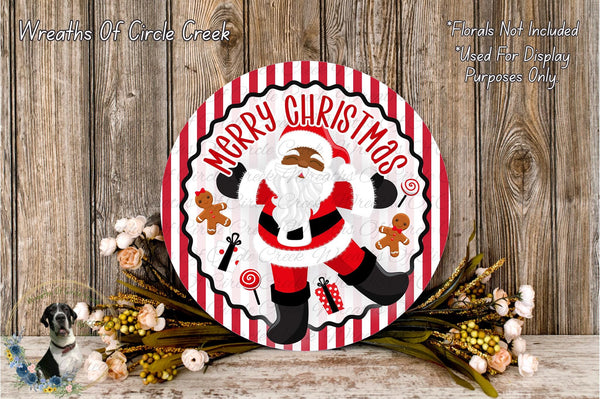 Dancing Santa Merry Christmas | Candy Stripe Holiday Decor | Lightweight Round Metal Wreath Sign | No Holes in Sign | Gingerbread Christmas
