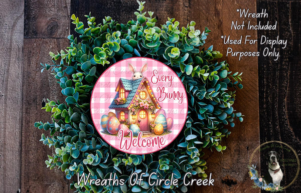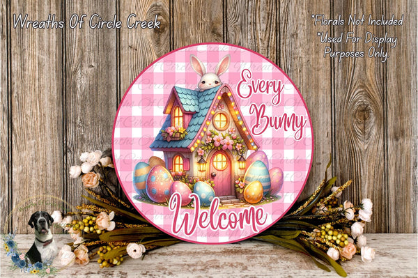 Every Bunny Welcome Pink Easter House Aluminum Metal Wreath Sign (Lightweight, No Holes)