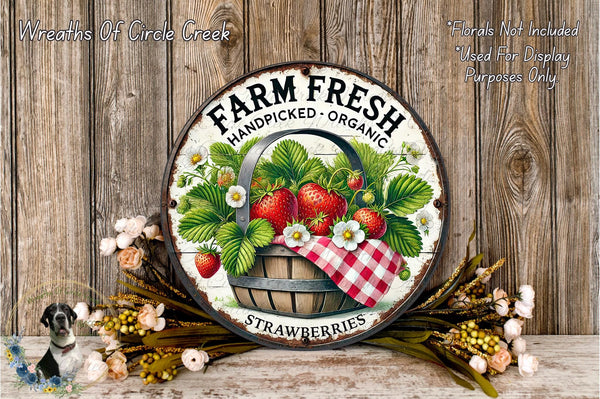 Farm Fresh Strawberries Sign | Lightweight Round Metal Wreath Sign | No Holes in Sign | Rustic Farmhouse Decor