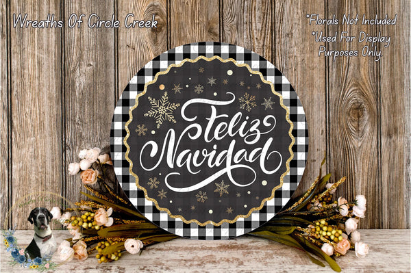 Feliz Navidad Black and Gold | Buffalo Plaid Christmas Decor | Lightweight Round Metal Wreath Sign | No Holes in Sign | Elegant Holiday Sign