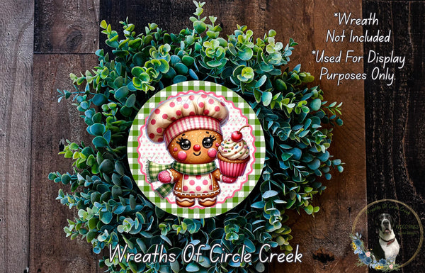 Gingerbread Baker | Holiday Cupcake Christmas Decor | Lightweight Round Metal Wreath Sign | No Holes | Farmhouse Kitchen Accent