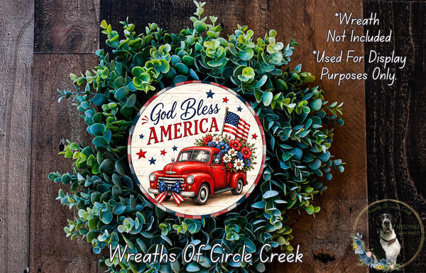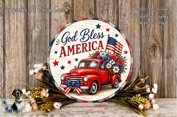God Bless America Patriotic Red Truck Floral Sign Farmhouse Americana Aluminum Metal Wreath Sign (Lightweight, No Holes)