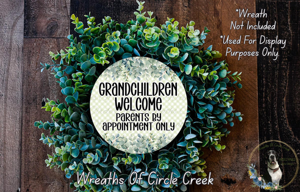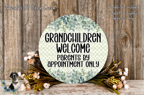 Grandchildren Welcome Parents by Appointment Only | Green Gingham Floral Decor | Lightweight Round Metal Wreath Sign | No Holes in Sign