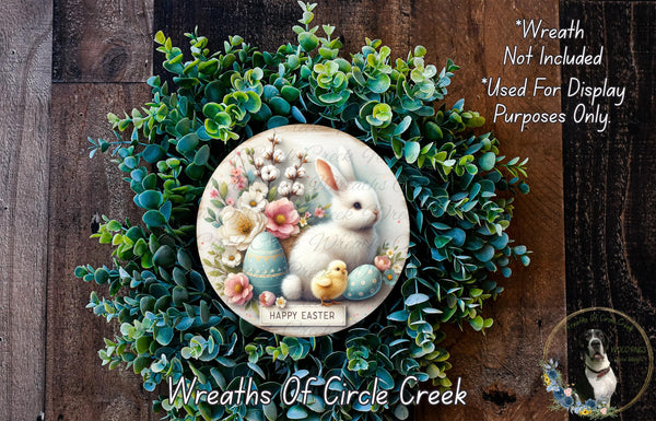 Happy Easter Bunny & Chick | Pastel Spring Floral Decor | Lightweight Round Metal Wreath Sign | No Holes in Sign | Easter Door Sign