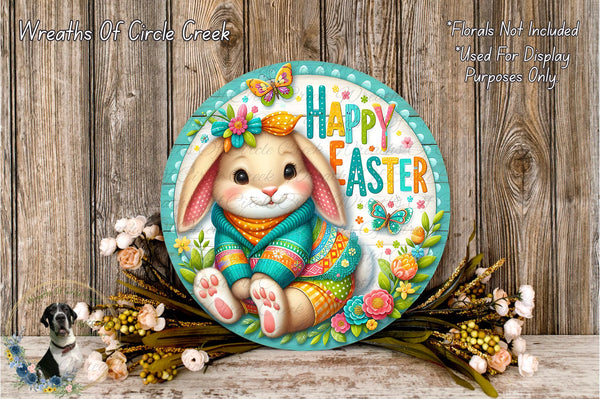 Happy Easter Bunny Floral Aluminum Metal Wreath Sign (Lightweight, No Holes)