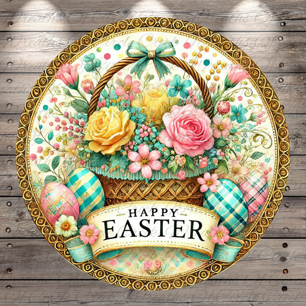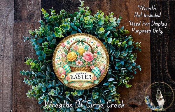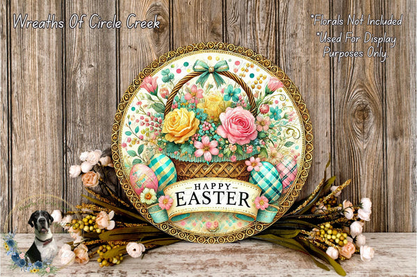 Happy Easter Floral Basket Aluminum Metal Wreath Sign (Lightweight, No Holes)