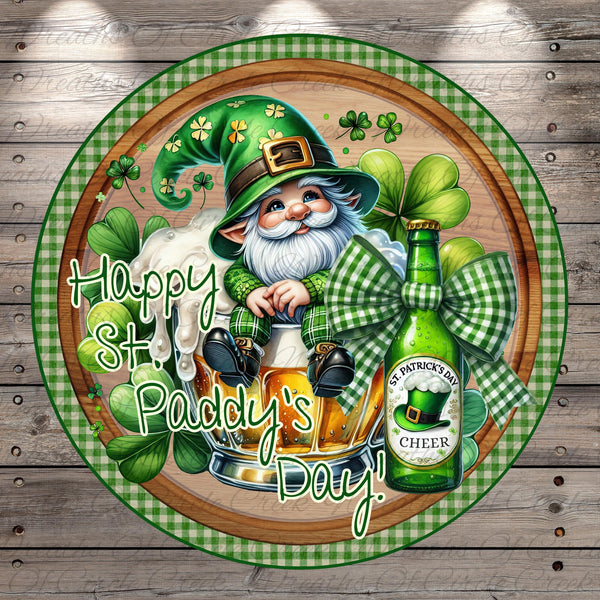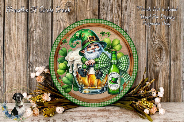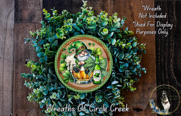 Happy Paddy’s Day Gnome Beer Aluminum Metal Wreath Sign (Lightweight, No Holes)