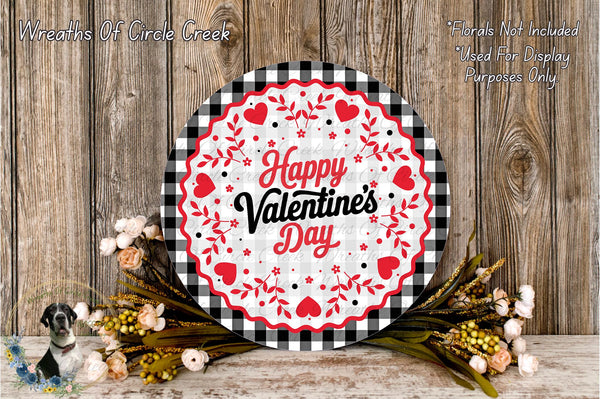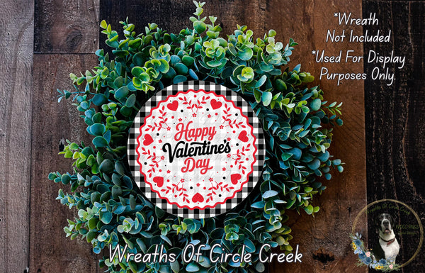 Happy Valentine’s Day Sign | Lightweight Round Metal Wreath Sign | No Holes in Sign | Black & White Plaid Heart Decor