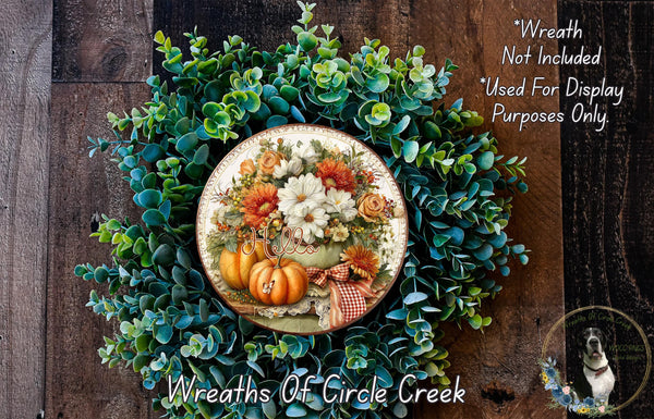 Hello Fall Floral Sign | Lightweight Round Metal Wreath Sign | No Holes in Sign | Autumn Pumpkin Decor