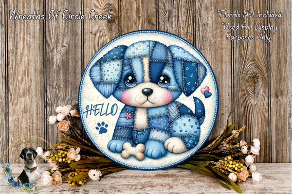 Hello Patchwork Puppy Blue Denim Aluminum Metal Wreath Sign (Lightweight, No Holes)