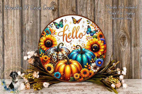 Hello Pumpkin Sign | Teal and Gold Fall Decor | Lightweight Round Metal Wreath Sign | No Holes in Sign | Sunflower Autumn Style