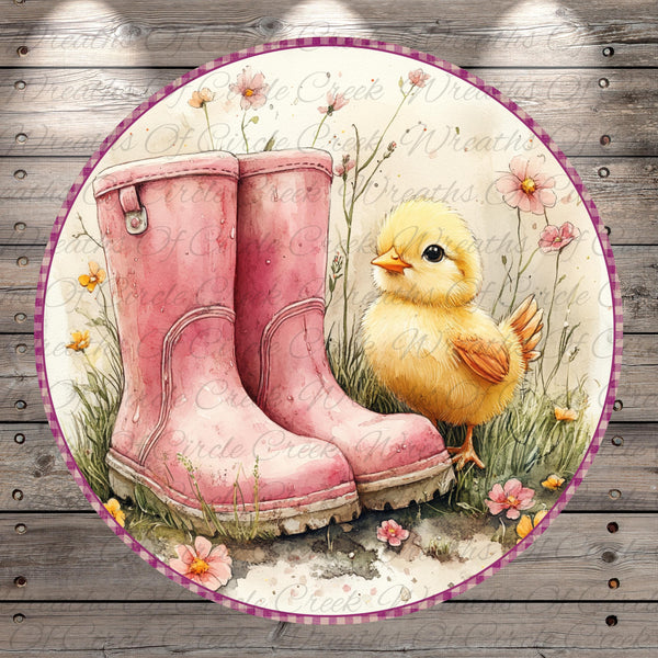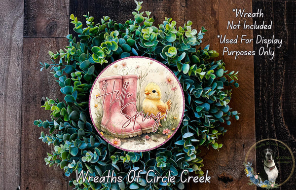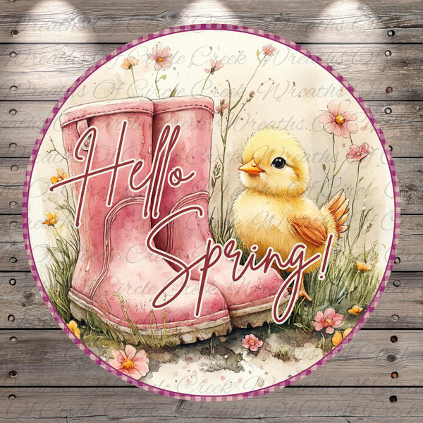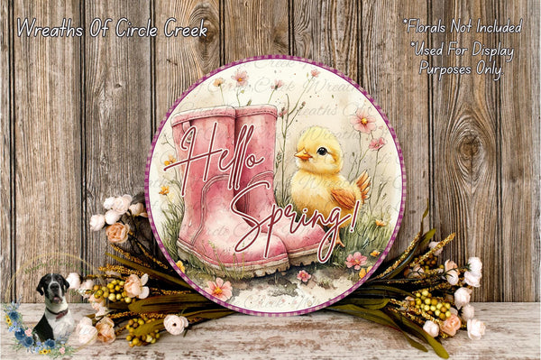 Hello Spring Pink Boots Chick Aluminum Metal Wreath Sign (Lightweight, No Holes)