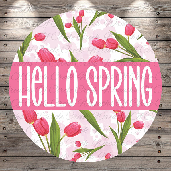 Hello Spring Pink Tulip Floral Aluminum Metal Wreath Sign (Lightweight, No Holes)