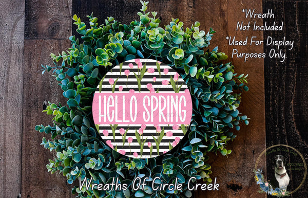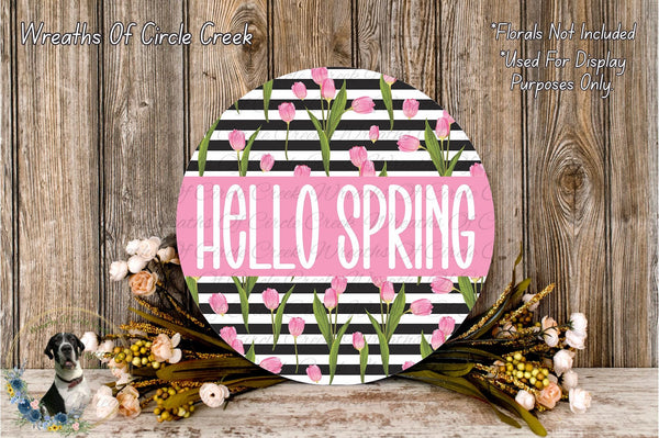 Hello Spring Pink Tulips Aluminum Metal Wreath Sign (Lightweight, No Holes)