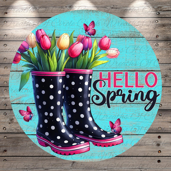 Hello Spring Tulip Rain Boots Aluminum Metal Wreath Sign (Lightweight, No Holes)