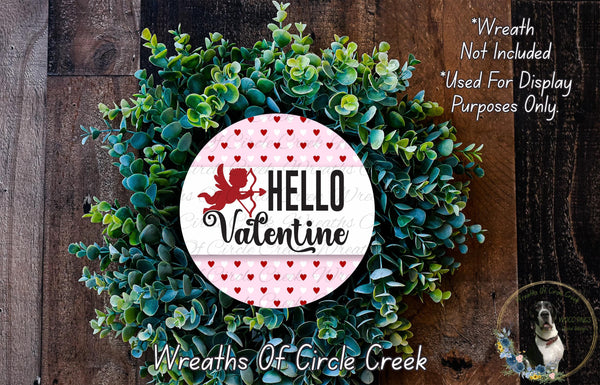 Hello Valentine Cupid Sign | Pink Heart Pattern Decor | Lightweight Round Metal Wreath Sign | No Holes in Sign | Sweet Valentine Home Decor