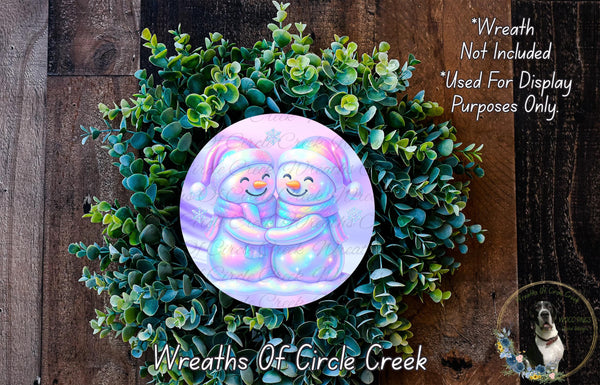 Holographic Snowmen Hug | Pastel Winter Wonderland Decor | Lightweight Round Metal Wreath Sign | No Holes in Sign | Cute Holiday Snowman