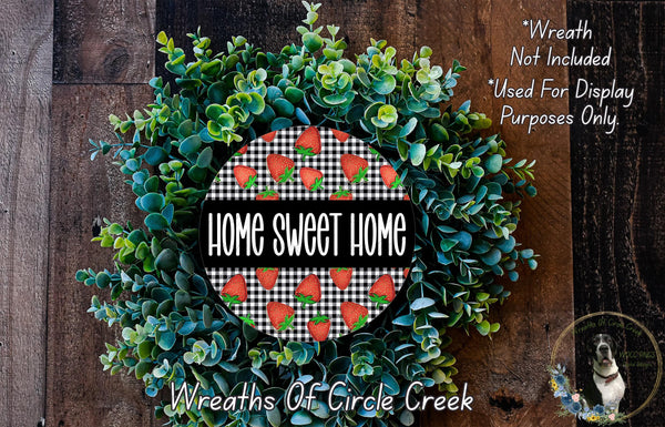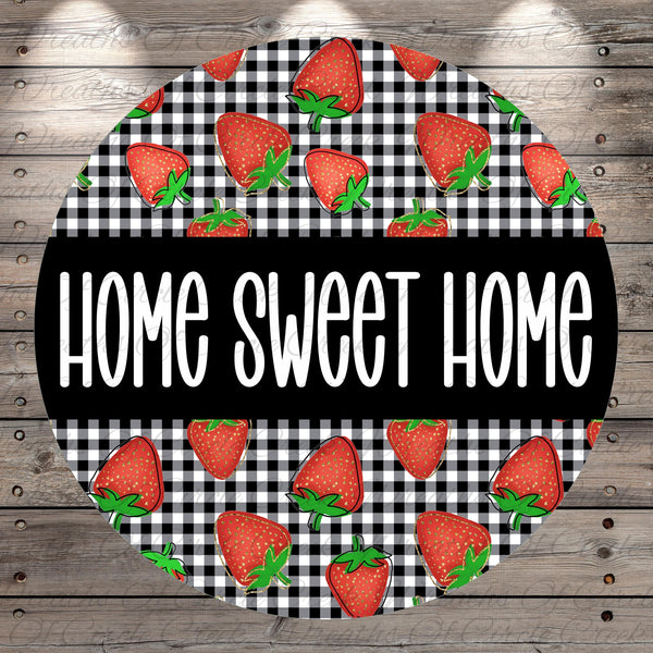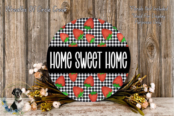 Home Sweet Home Strawberry Black Gingham Aluminum Metal Wreath Sign (Lightweight, No Holes)