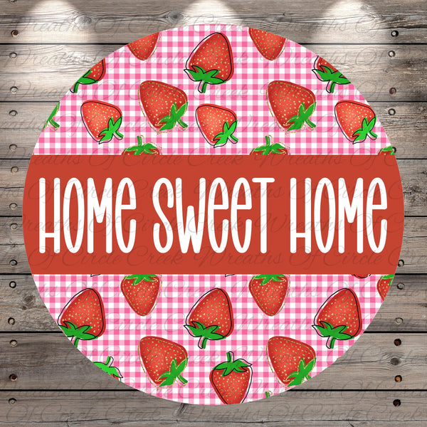 Home Sweet Home Strawberry Pink Gingham Aluminum Metal Wreath Sign (Lightweight, No Holes)