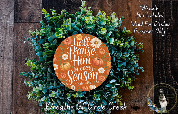 I Will Praise Him in Every Season | Pumpkin Floral Fall Decor | Lightweight Round Metal Wreath Sign | No Holes in Sign | Christian Autumn