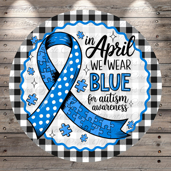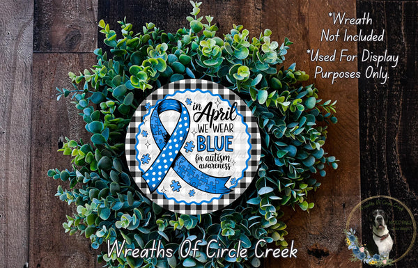 In April We Wear Blue Autism Awareness Aluminum Metal Wreath Sign (Lightweight, No Holes)