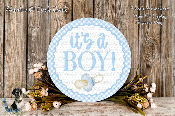 It’s a Boy Wreath Sign | Blue Baby Shower Pacifier Design | Lightweight Round Metal Wreath Sign | No Holes | Gender Reveal or Newborn Decor
