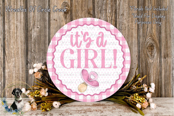 It’s a Girl Wreath Sign | Pink Baby Shower Pacifier Design | Lightweight Round Metal Wreath Sign | No Holes | Gender Reveal or Newborn Decor