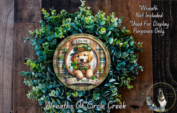 Kiss Me I’m Irish Dog Sign | St. Patrick’s Day Decor | Lightweight Round Metal Wreath Sign | No Holes in Sign | Farmhouse Lucky Style