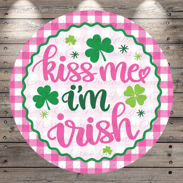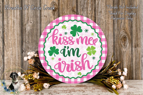 Kiss Me I’m Irish Pink Gingham Aluminum Metal Wreath Sign (Lightweight, No Holes)