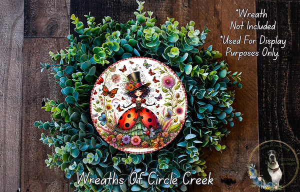 Ladybug Garden Girl Whimsical Spring Aluminum Metal Wreath Sign (Lightweight, No Holes)