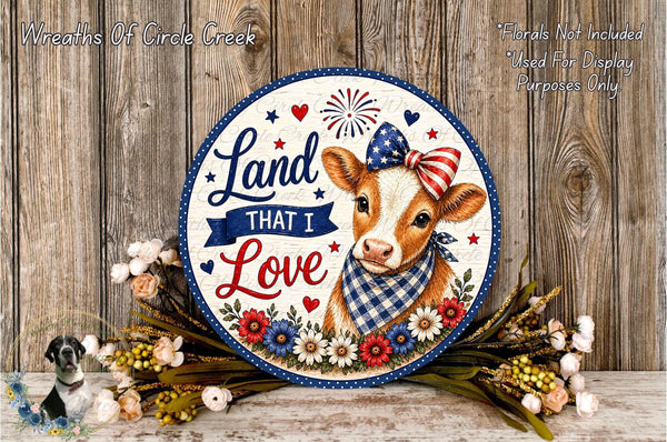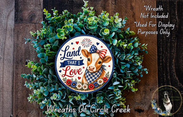 Land That I Love Guernsey Calf Patriotic Cow Sign Blue Polka Dot Gingham Bow Farmhouse Aluminum Metal Wreath Sign (Lightweight, No Holes)