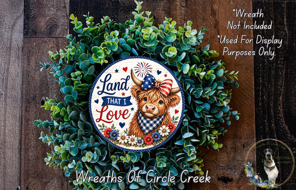 Land That I Love Highland Cow Patriotic Sign Blue Polka Dot Gingham Bow Farmhouse Aluminum Metal Wreath Sign (Lightweight, No Holes)