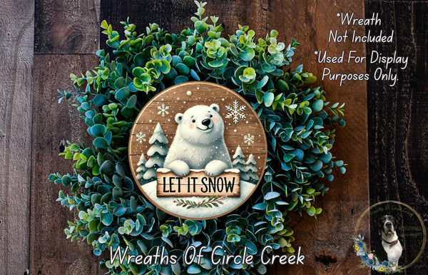 Let It Snow Polar Bear Sign | Cute Winter Cabin Decor | Lightweight Round Metal Wreath Sign | No Holes in Sign | Rustic Christmas Door Sign