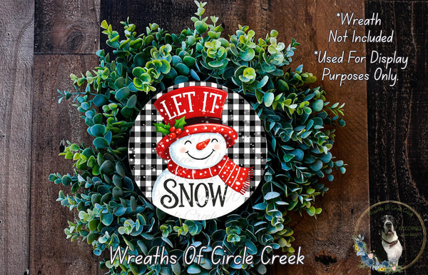 Let It Snow Snowman | Lightweight Round Metal Wreath Sign | No Holes in Sign | Winter Buffalo Plaid Decor